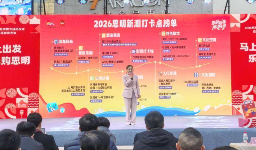 人民网厦门1月26日电 (记者张萌)近日,“2026思明新春旅购季”活动举行,现场发布了“2026思明新潮打卡点”榜单,涵盖了沙坡尾、如意桥等21个特色点位。此次活动旨在进一步挖掘厦门市思明区文旅商新亮点,串联新动线,打造旅游消费新场景与新体验。