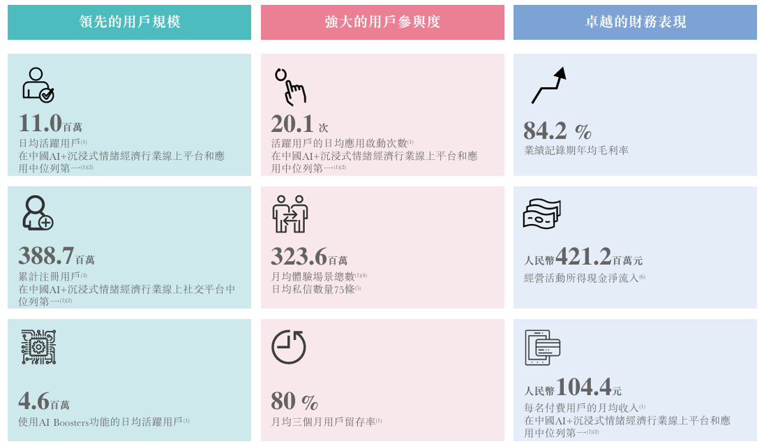 与前两次递表相比,新版本中最显著的变化,是Soul将AI提升至战略与募资用途的第一位。Soul X大模型被用来描述其“沉浸式社交体验”,公司披露已有460万日活用户使用AI功能,付费用户的月均贡献为104.4元。