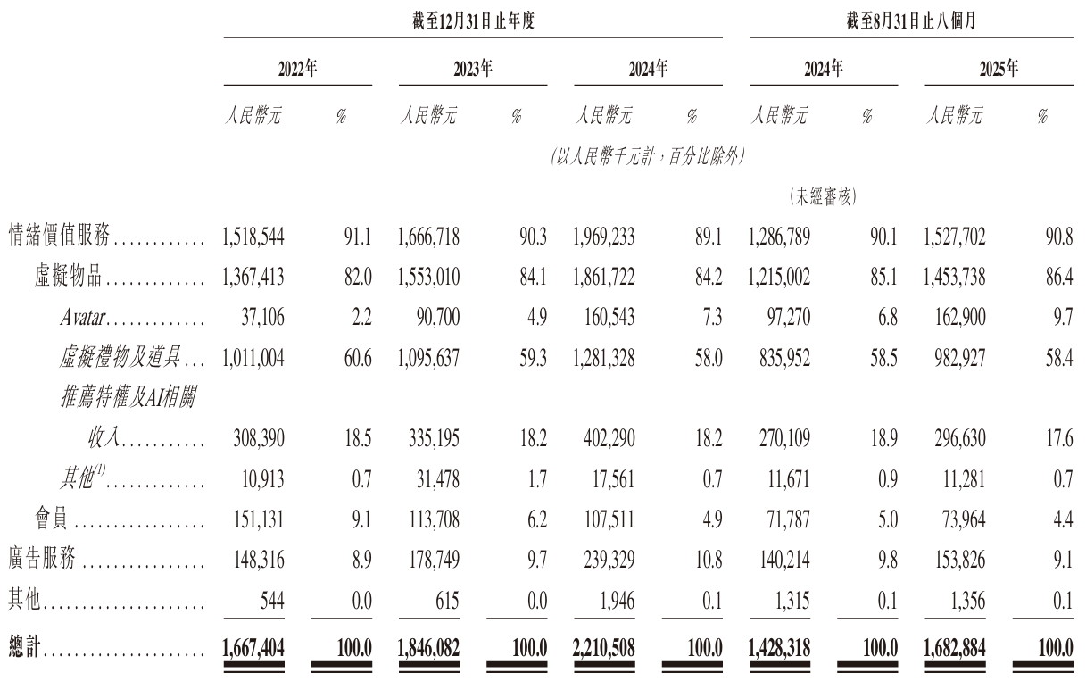 而且,公司的收入结构也在放大风险。今年前8个月,虚拟礼物与会员特权(情绪价值服务收入)占比达90.8%,广告和其他业务的贡献仍然有限。高度依赖付费用户的模式对宏观环境与用户情绪更加敏感,缺乏多元业务支撑时,削减费用带来的利润改善难以长期维持。